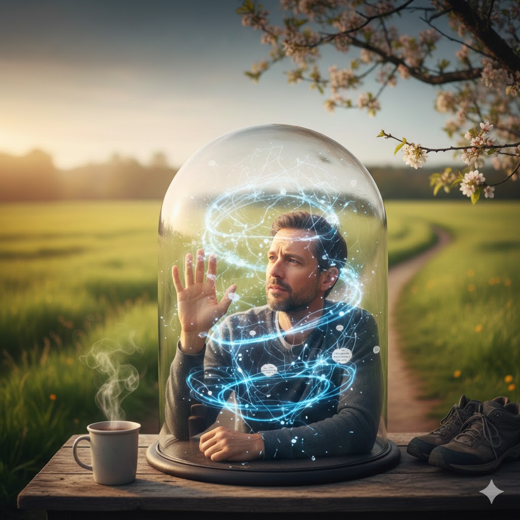 Wir können uns nicht gesund „denken“, auch nicht mit noch so viel positivem Aufwand. Die Hyperreflexivität ist eine Sackgasse: Während wir im Kopf nach dem Schalter für die Heilung suchen, zieht das echte Leben draußen an uns vorbei. Ich habe gelernt, dass die Frage „Wie geht es mir?“ oft nur Kraft raubt, während „Was ist jetzt?“ mich zurück in die Welt holt.